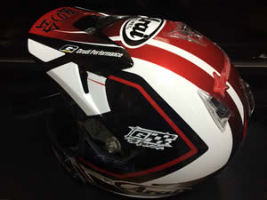 に求められる性能をさらに追求したヘルメットの登場です。 帽体形状は、軽量コン パクトを継承しながら もさらなる安全性確保 のため、あご部分の保 護範囲を前方に約40mm拡大。 あご部分拡大に基づき、転倒時の顔 面への衝撃を緩和させる透明なポリ カーボネイト製のロックガードを装着。 下部よりエ ンジン音の変化が聞き取りや すい〈サウンドポート〉を上部にも設け、 マインダーの声や内部への通気性向上のために新形状イヤーカップに進化。 FIMのルールブックでは、特にジュニアライダーにチンガードは