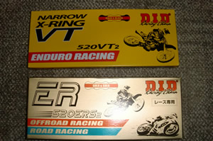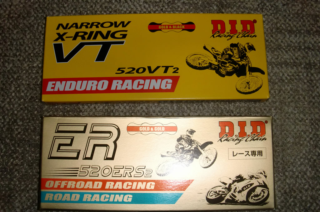 DIDチェーン それは最も軽くて、史上最強のチェーン 上はNARROW-XRING VTはハスクバーナTE250で使ってるもの 下は520ERS ガスガスTXTラガで使っています DIDチェーンはトライアル始めた頃から何十年と愛用している信頼のブランド |